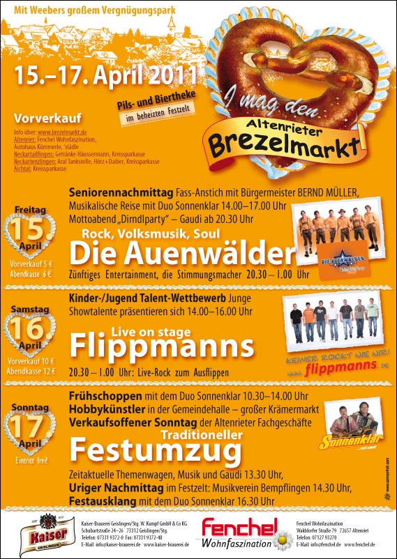 Ein wunderschönes Fest ist zu Ende. Zahlreiche Besucher aus nah und fern hat unseren Brezelmarkt 2011 besucht, deshalb ein herzliches Dankeschön.